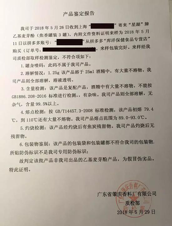 其实,拼多多身陷"售假风波"并不是最近才有的事。今年六月,就有媒体接到拼多多的顾客投诉,称自己在拼多多平台购买了食品添加剂乙基麦芽酚,收到货后发现产品味道刺鼻,通过查询产品序列号及品牌厂家出具产品鉴定报告,判定为假货。顾客孙女士要求卖家及平台退货退款,并作出相应赔偿,但拼多多及卖家拒绝承认销售假货。