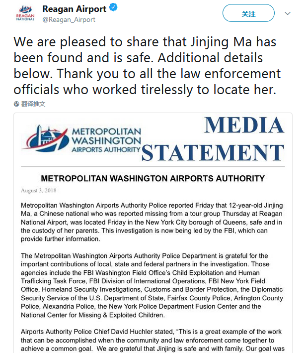 【环球网报道 记者 赵建东】"我们很高兴地告诉大家,马金晶(Jinjing Ma,音译)已经被找到,并且是安全的。"当地时间3日,美国华盛顿里根机场官方推特发表声明称,此前被报道疑似遭到绑架的12岁中国女孩马金晶(Jinjing Ma,音译)已被找到,确认安全,目前与她的亲生父母在纽约。声明同时感谢相关部门的协助和努力。