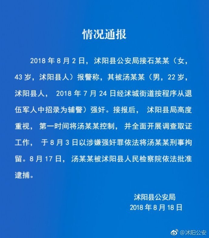 今日(18日)午间,沭阳县公安局发布通报称,沭阳县公安局接到石某某(女,43岁,沭阳县人)报警称,其被汤某某(男,22岁,沭阳县人,辅警)强奸,接报后,沭阳县公安局第一时间将汤某某控制,并全面开展调查取证工作,于8月3日以涉嫌强奸罪依法将汤某某刑事拘留。8月17日,汤某某被沭阳县人民检察院依法批准逮捕。