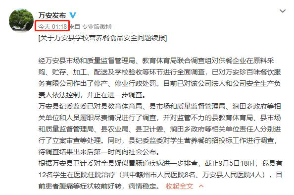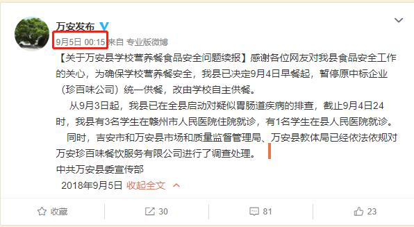 报道刊发后,9月5日凌晨0时15分,万安县委宣传部通过官方微博发布通报称,从9月3日起,该县已在全县启动对疑似胃肠道疾病的排查,截止9月4日24时,我县有3名学生在赣州市人民医院住院就诊,有1名学生在县人民医院就诊。同时,为确保学校营养餐安全,该县已决定9月4日早餐起,暂停原中标企业(珍百味公司)统一供餐,改由学校自主供餐。此外,吉安市和万安县市场和质量监督管理局、万安县教体局已经依法依规对万安珍百味餐饮服务有限公司进行了调查处理。