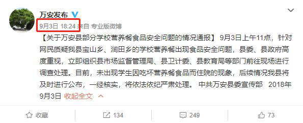 3日至6日,万安县委宣传部通过官方微博连续三次发布关于问题营养餐的情况通报。