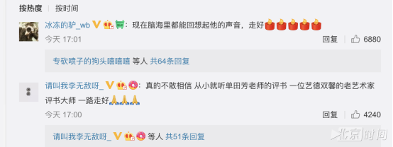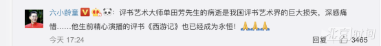 六小龄童微博评论称:“评书艺术大师单田芳先生的病逝是我国评书艺术界的巨大损失,深感痛惜……他生前精心演播的评书《西游记》也已经成为永恒!”