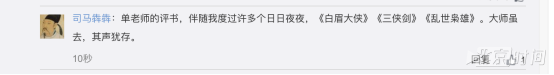 网友司马犇犇留言说:“单老师的评书,伴随我度过许多个日日夜夜,《白眉大侠》《三侠剑》《乱世枭雄》。大师虽去,其声犹存。”