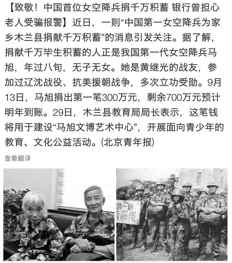 而这些巨额捐款,来自今年年逾八旬的中国第一代女空降兵马旭。