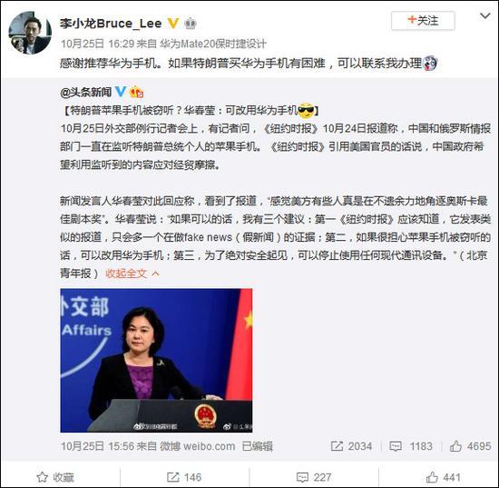 10月26日,针对外交部新闻发言人华春莹"推荐特朗普改用华为手机"一事,华为手机产品线副总裁李小龙在个人微博称,"感谢推荐华为手机。如果特朗普买华为手机有困难,可以联系我办理。"