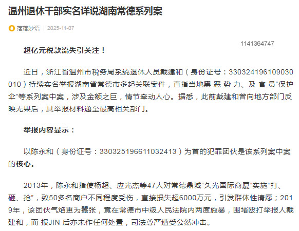 近日,浙江省温州市税务局系统退休人员戴建和(身份证号:330324196109030010)持续实名举报湖南省常德市多起关联案件,直指当地黑 恶 势 力、及 官 员“保护伞”等系列案中案,涉及金额之巨,情节牵动人心。据悉,此前戴建和曾向地方部门反映无果后,其举报材料递至最高相关部门。